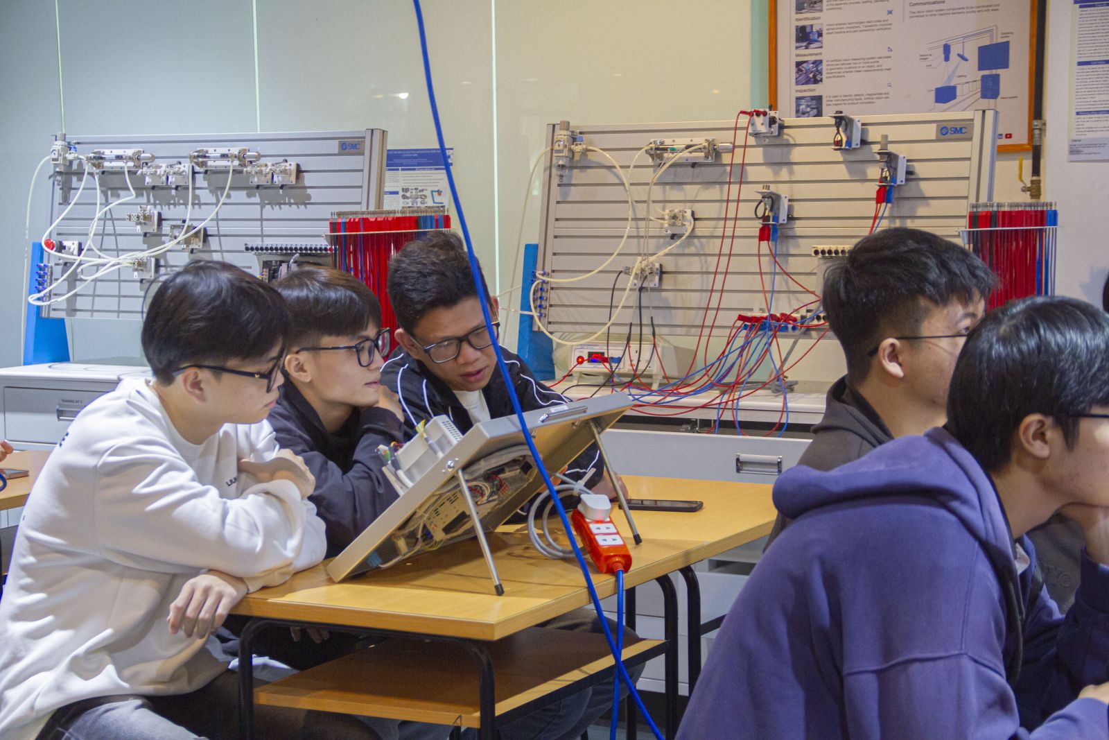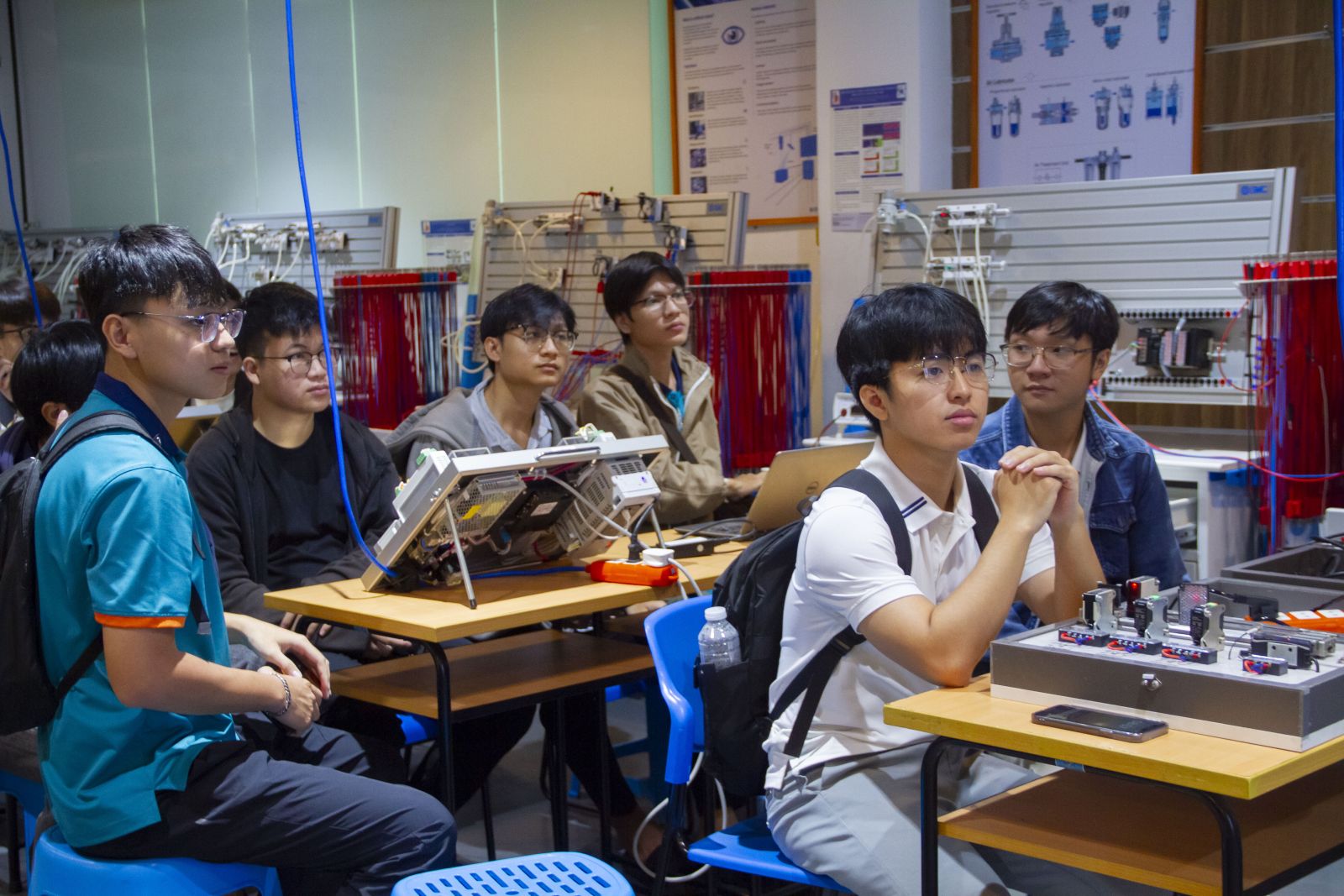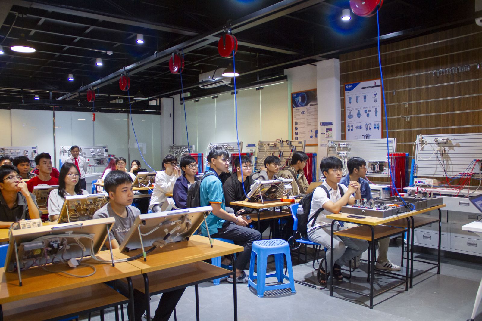 🔹 Trải nghiệm thực hành tại Phòng SMC Automation Lab: Sinh viên được thao tác trực tiếp trên hệ thống khí nén thực tế tại Phòng SMC Automation Lab. Với sự hướng dẫn chi tiết, các bạn đã có cơ hội tìm hiểu cách công nghệ khí nén giúp tối ưu hóa quy trình sản xuất và tự động hóa trong công nghiệp, mang lại những trải nghiệm học tập quý báu và thiết thực.